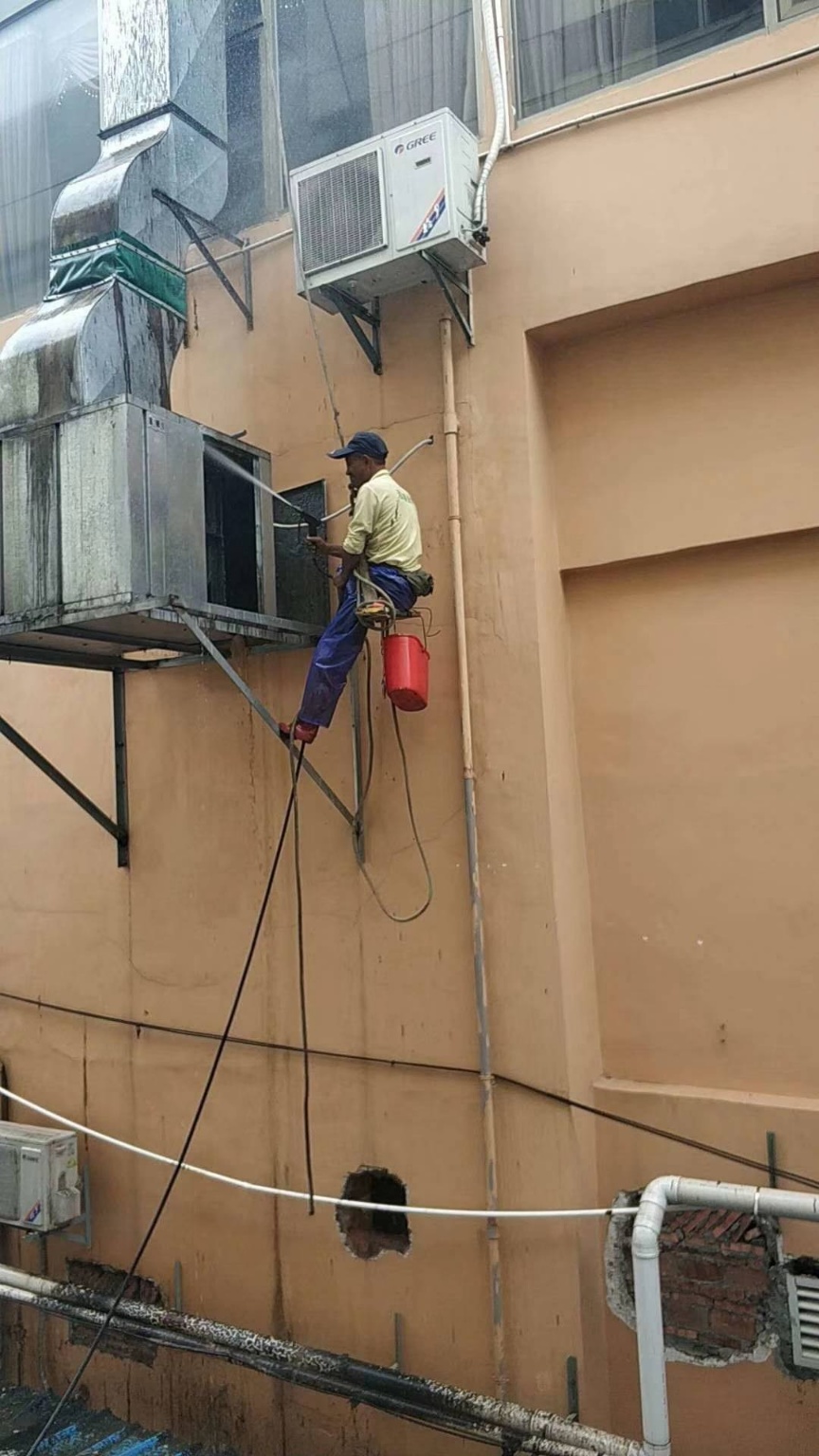 这个方法主要适用于清洗50公分以上的竖油烟管道。管道的最上截和最下截先由技术人员拆开,技术人员系着安全绳从上而下清洗烟道内的污垢。这个方法比较危险,技术要求高,费用高,但清洗效果好。