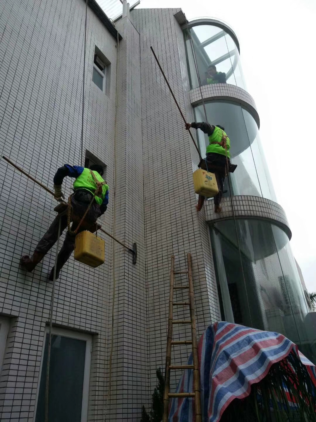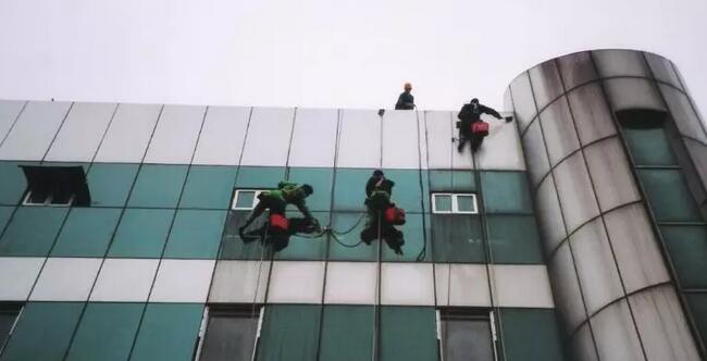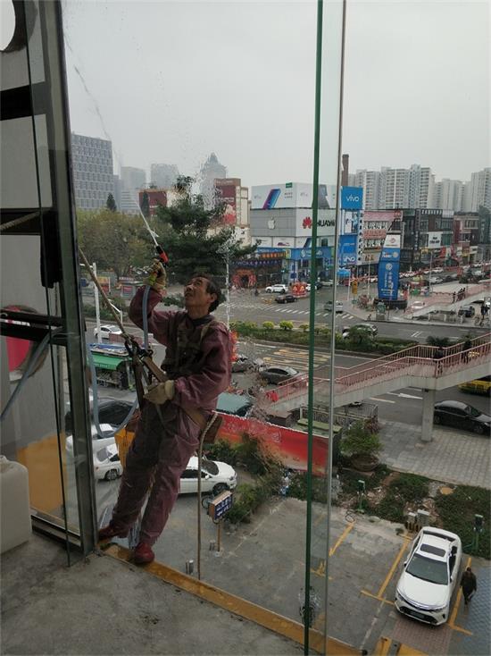 至于清洁玻璃外墙那就跟以上的有些不一样了。首先在开始清洁工作前要把一切的安全措施给检查一遍是否合格,再使用吊蓝或吊板将施工人员吊于要清洗的外墙面,首先要先检查玻璃的表面是否有粘着物,如果有可用刮刀或溶剂将其清除,然后再根据玻璃的污染程度使用不同的工具清洗,一般用到的工具都有百洁布、胶刮、磨盘、刷子等等。每清洗完一块地方,就滑动吊板或吊蓝,将高度下降进行下一处的清洁,直到需要清洗的玻璃清洁完成为止。