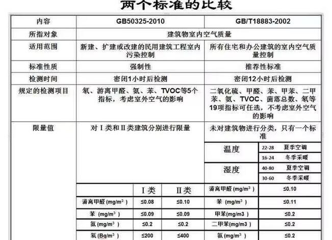 一类是限定室内空气污染物应该达到的水平,例如《室内空气质量标准》和《民用建筑室内环境污染控制规范》;另一类是室内污染源的限定标准,例如人造板、地毯、涂料等各种室内装修材料污染物含量的限值。