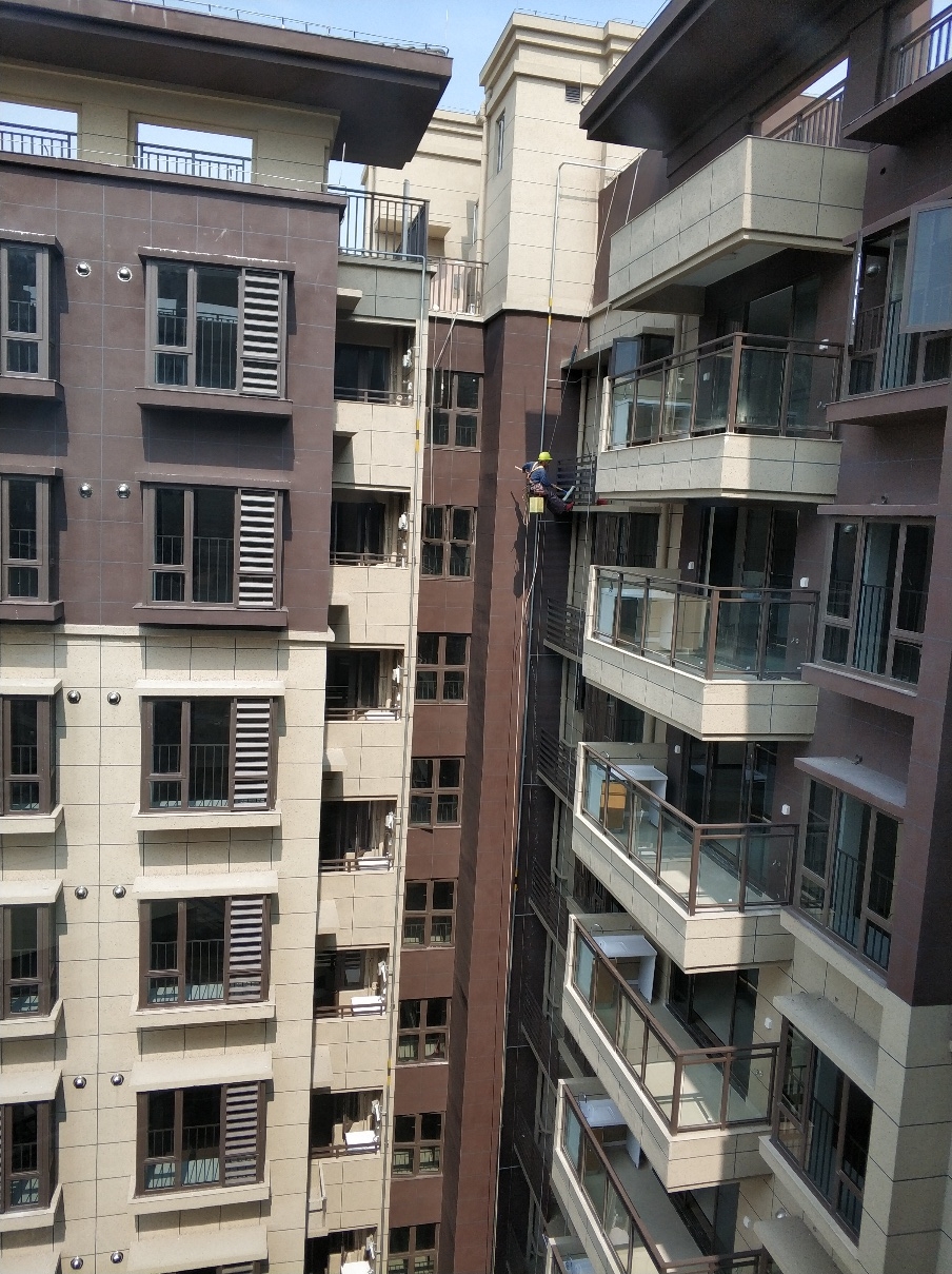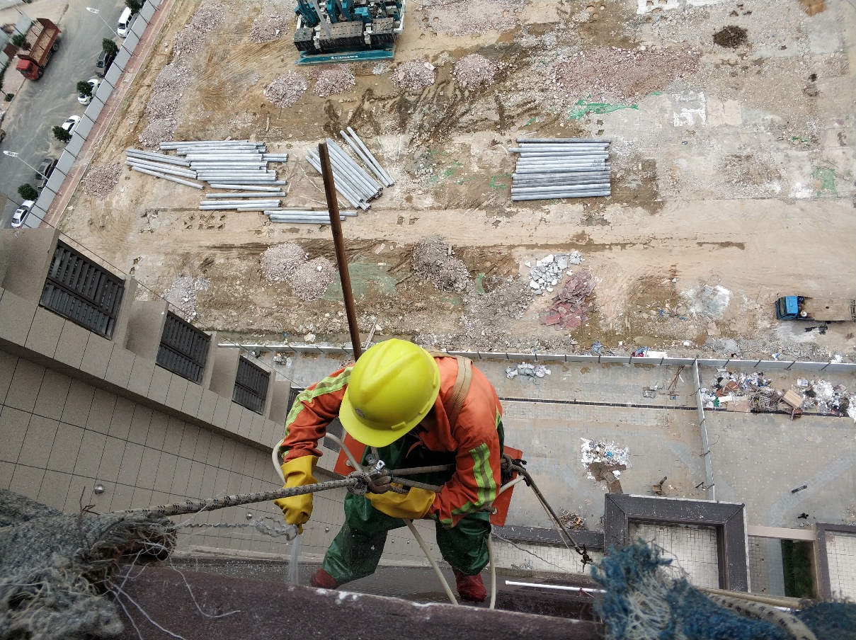 9、施工员要落地时,要先察看一下地面、墙壁的设施,操作绳、安全绳的定位及行人流量的多少情况,待地面监护人员处理、调整,同意后方可缓慢下降,直至地面。